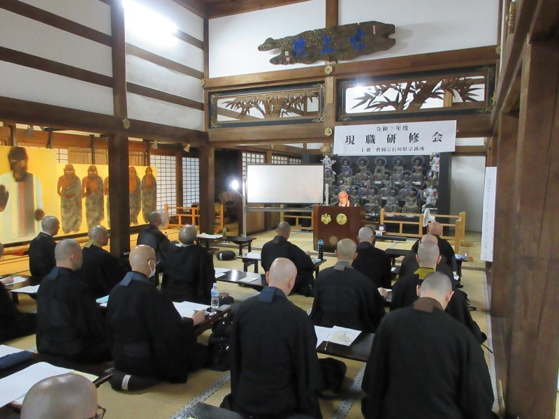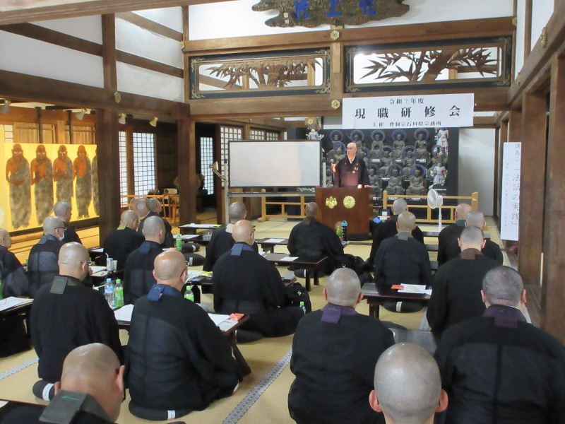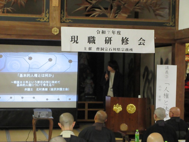 行持 2025/09/25 宗務所 令和7年度現職研修会が開催されました 令和7年度現職研修会が羽咋市永光寺にて開催され、県内宗侶34名が参加しました。 福井県龍泉寺ご住職山口正章老師による「曹洞宗と両大本山制」についての講義、愛知県新蔵寺ご住職竹川正悟老師による「法話の実践」についての講義、金沢市弁護士会所属の北村勇樹弁護士による人権学習が行われました。