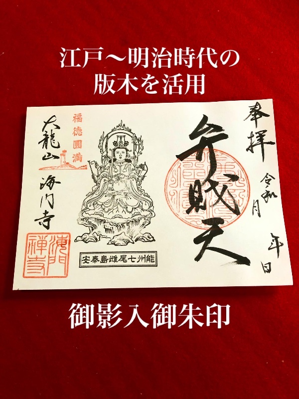 当山に祀られる秘仏 弁財天像と同じ、頭頂に白蛇と鳥居をいただき、八本の腕をそなえた宇賀弁財天が刻印されています。